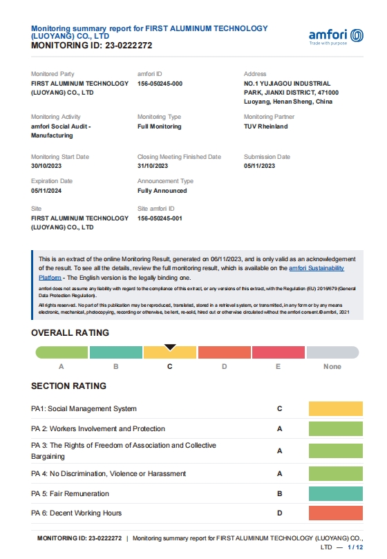 一鋁科技(洛陽)有限公司榮幸宣布我司成功獲得BSCI證書,這標志著我們在社會責任和可持續(xù)發(fā)展方面的不懈努力得到認可。我們將繼續(xù)致力于為客戶提供高品質(zhì)產(chǎn)品的同時,推動可持續(xù)生產(chǎn)和貿(mào)易的發(fā)展。
